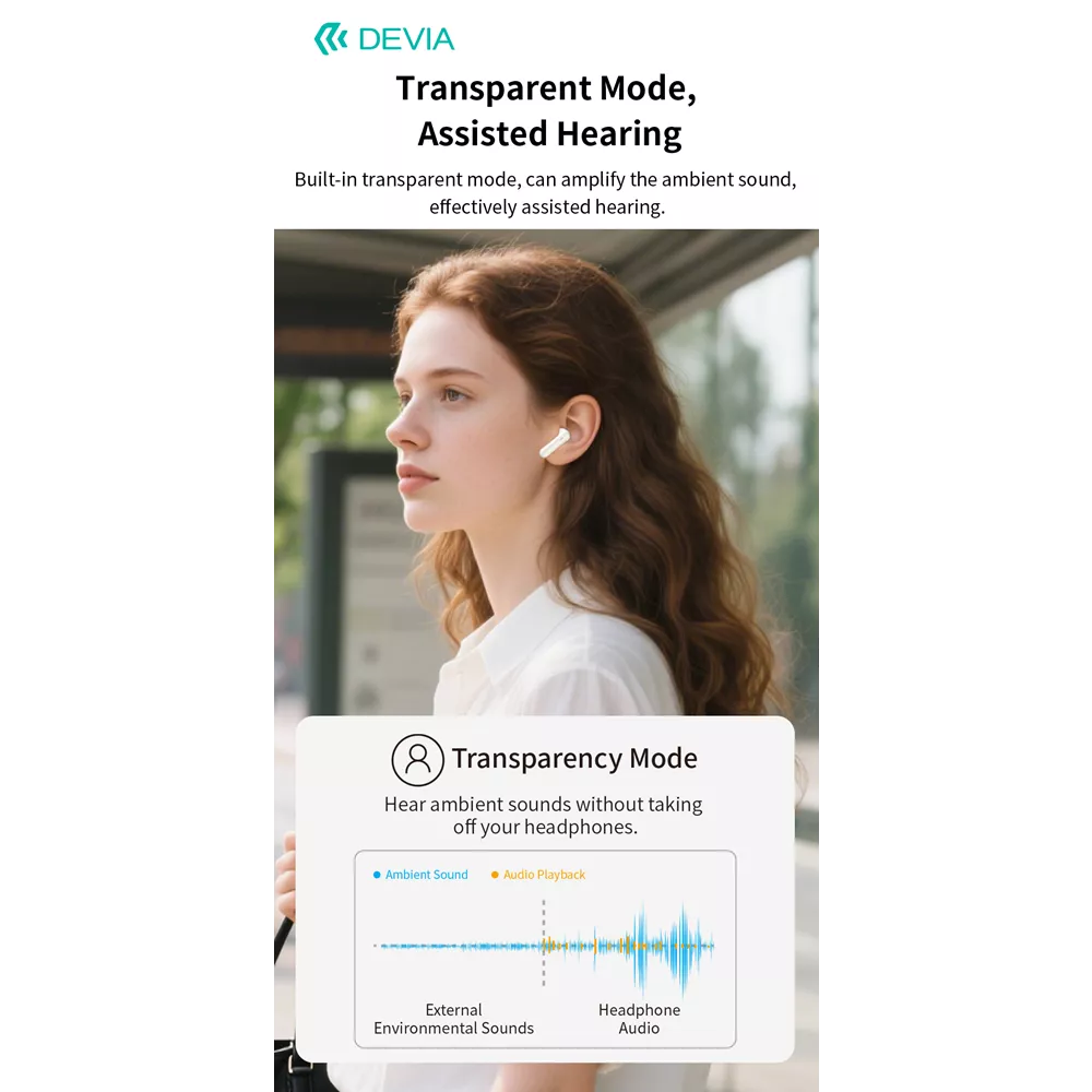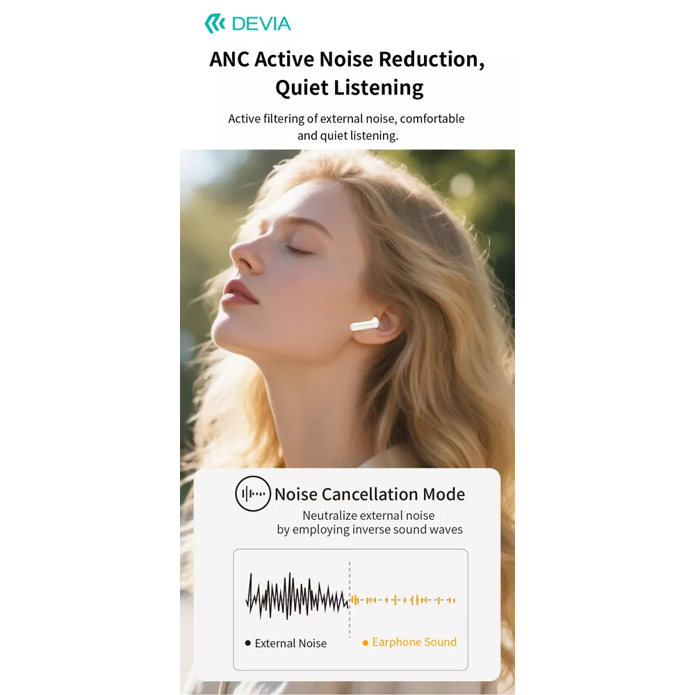Devia’s ANC TWS Pro3 takes the initiative to reduce ambient noise up to 30 dB, isolating your audio from busy streets, office chatter, or airborne distractions. The advanced digital signal processor continuously adapts to your surroundings, delivering a serene listening environment whether you’re commuting or working in a crowded café.